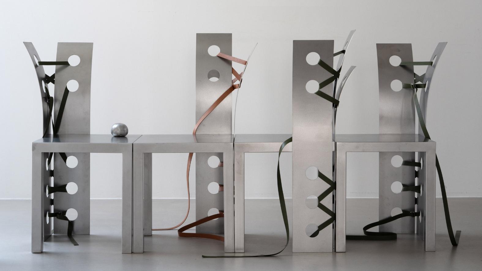 Парижский архитектор корейского происхождения Нара Ли представила свою новую коллекцию мебели Pul на выставке The Sun Room, прошедшей в здании Mirae Building в Сеуле. Экспозиция включала кресла, скамьи и декоративные экраны, выполненные из листов нержавеющей стали и широких кожаных ремней, продетых через крупные отверстия в конструкции.