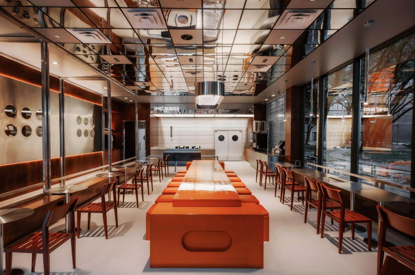 В Хьюстоне, в торговом центре The Galleria, открылся новый ресторан сети OMG! Burger, интерьер которого был спроектирован местной дизайн-студией Studio Danel. Главным акцентом пространства стала мебель — прежде всего, крупный оранжевый лакированный стол, протянувшийся через центр зала площадью около 2000 квадратных футов.
